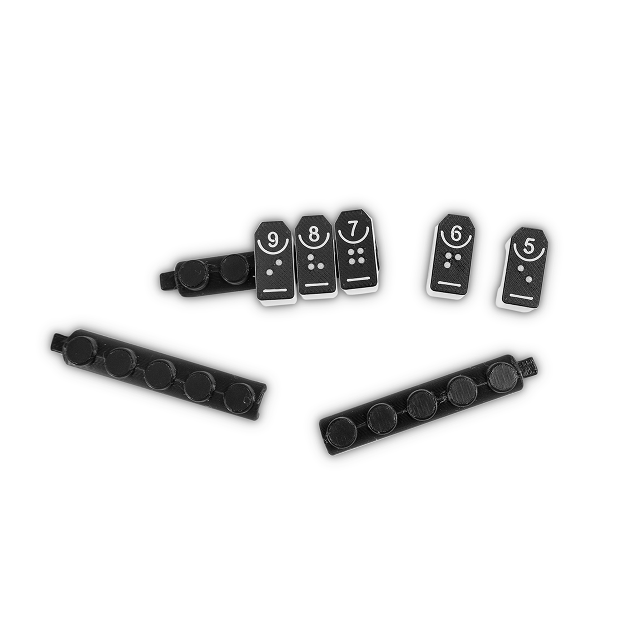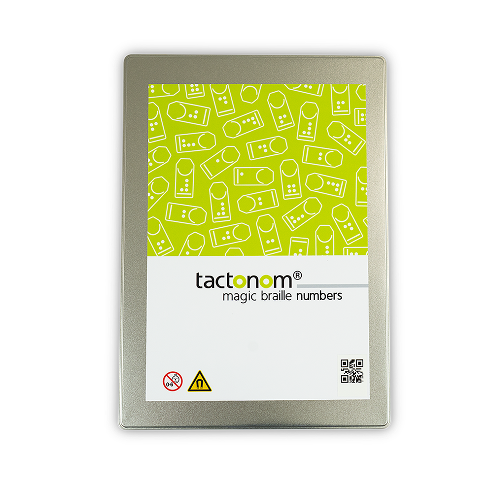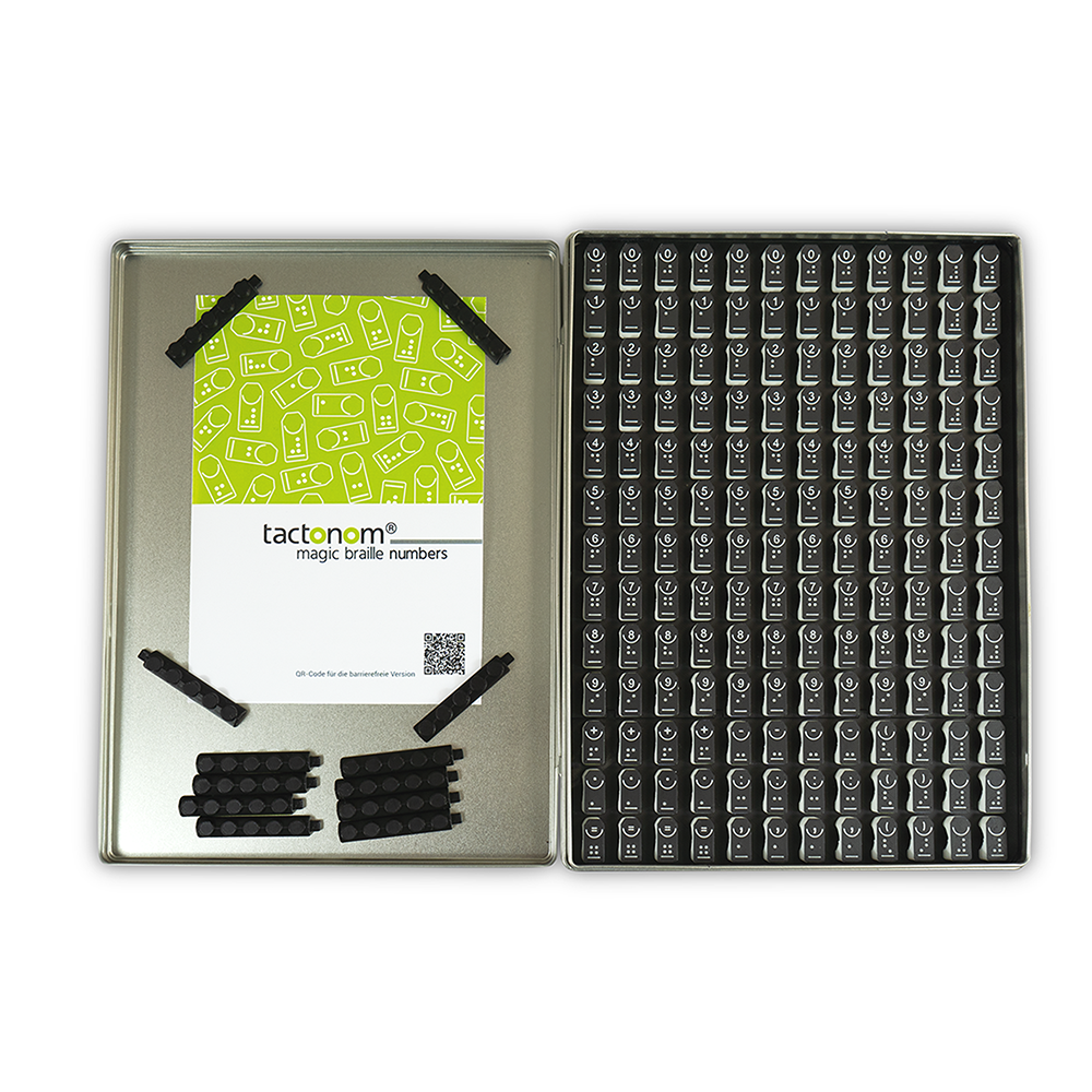 Der Tactonom Reader Flex erkennt die Zahlen automatisch und ermöglicht so interaktives, spielerisches und motivierendes Lernen. Durch magnetische Steckhilfen können die Steine sicher auf metallischen Oberflächen platziert werden. Jeder Stein ist mit tastbarer Brailleschrift versehen, zusätzlich sorgt Schwarzschrift für inklusives Arbeiten im gemeinsamen Unterricht. Eine bahnbrechende Neuerung in der Mathematik!